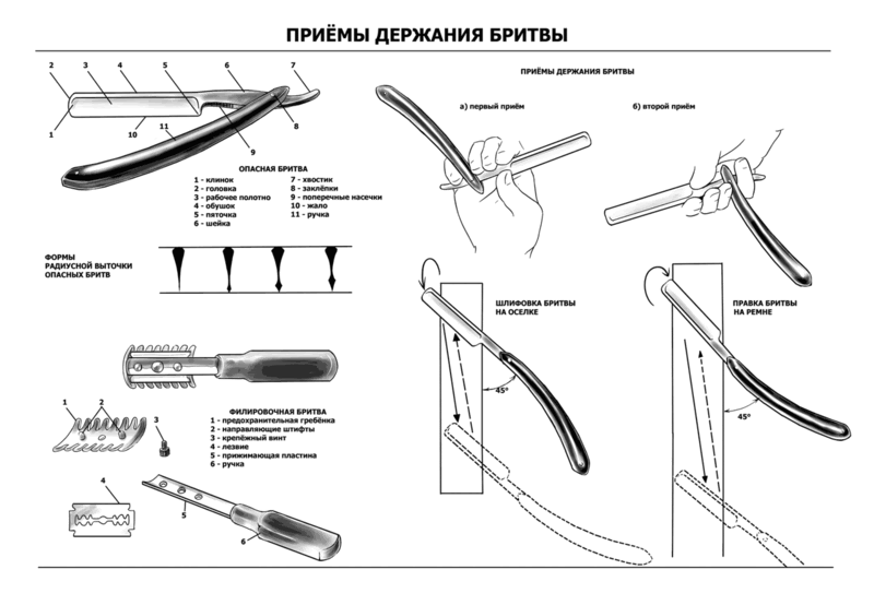 Как правильно править бритву видно на схемке. Не забудьте, что при правке бритву надо переворачивать через обушок.